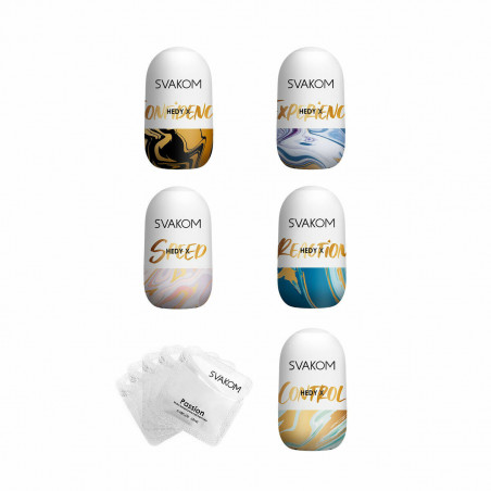 Svakom Hedy X. Tipo de producto: Conjunto de masturbadores, Apertura: Neutral, Color del producto: Translúcido. Ancho: 56 mm, Profundidad: 56 mm, Altura: 99,2 mm. Cantidad por paquete: 5 pieza(s)